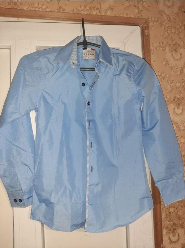Сорочка для хлопчика небесно-голубого кольору Lagard Kids. Розмір написано 10. Прислали родичі з Америки, а виявилась замаленька. Довжина плеча 11 см, довжина рукава 47 см, спинка 40 см, довжина сорочки 57 см