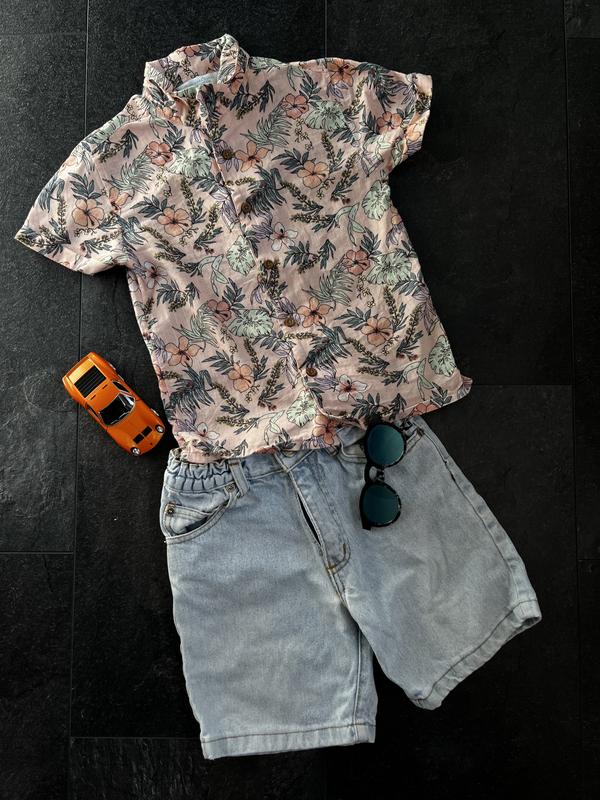 Крутезна сорочка на модника в стильний тропічний принт, 100% котон, надто приємна до тіла Дерев’яні гудзики, з боків є розрізи Primark 5-6 років Стан нової