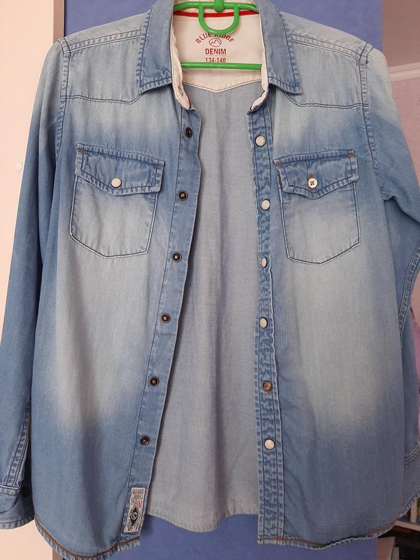 Рубашка джинсовая, размер 134/140. длина по спинке - 58-60.см длина рукава от плеча - 52 см