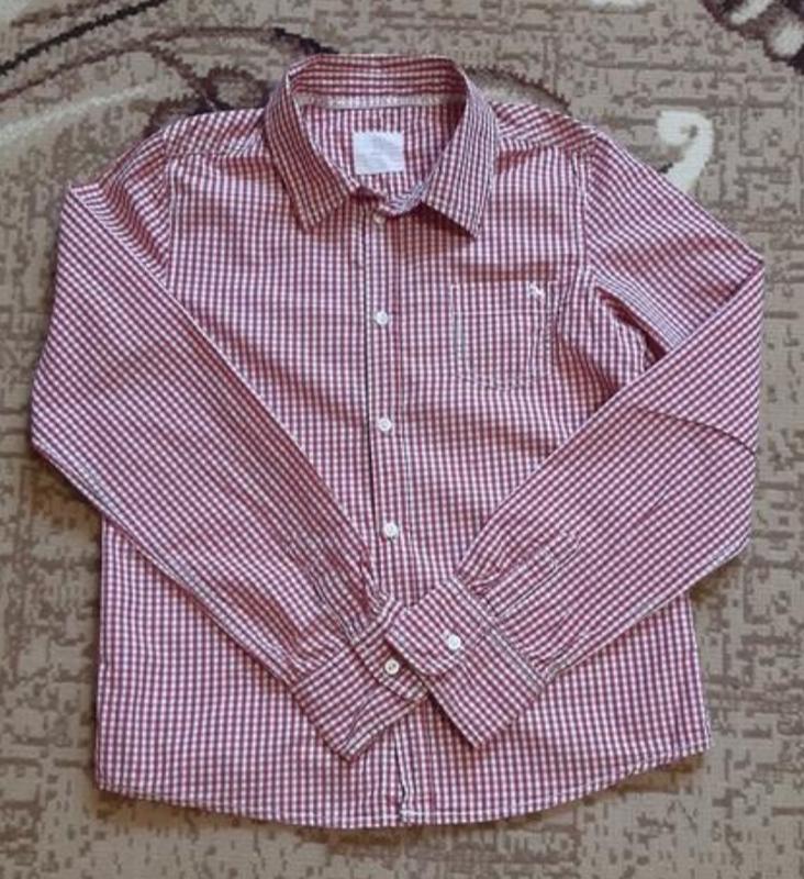 Стильная коттоновая рубашка на длинный рукав для малого джентльмена. Цвет полосок красный. Состояние новой вещи.