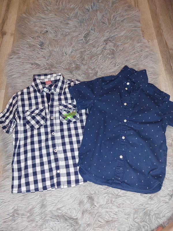 В идеальном состоянии, на 5-6 лет. Темно-синяя с якорями h&m. Бело- синяя в клетку на 5-6 лет