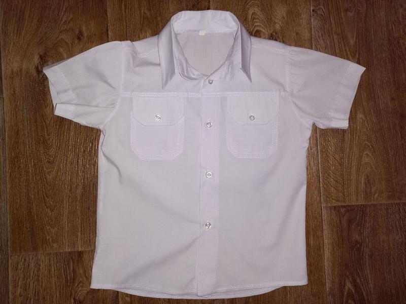 Белая рубашка с коротким рукавом.эффектов нет, Длина от ворота -52 см. ПОГ-41 см, рукав-15 см.плечи -35 см.