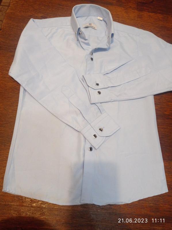 Классная, качественная рубашка Dino Sessun небесно голубого цвета в отличном состоянии на ребенка 6 лет. Длина изделия по спинке 53 см, ПОГ 35 см, от плеча до плеча 33, длина рукава от плеча 38 см (с манжетом 43). Модель 2192