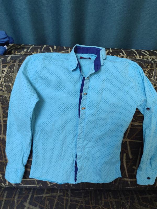 рубашка голубая, трубка делаются короткими, есть пугвица выше лаптя,на 134-146, замеры по запросу, перешлю