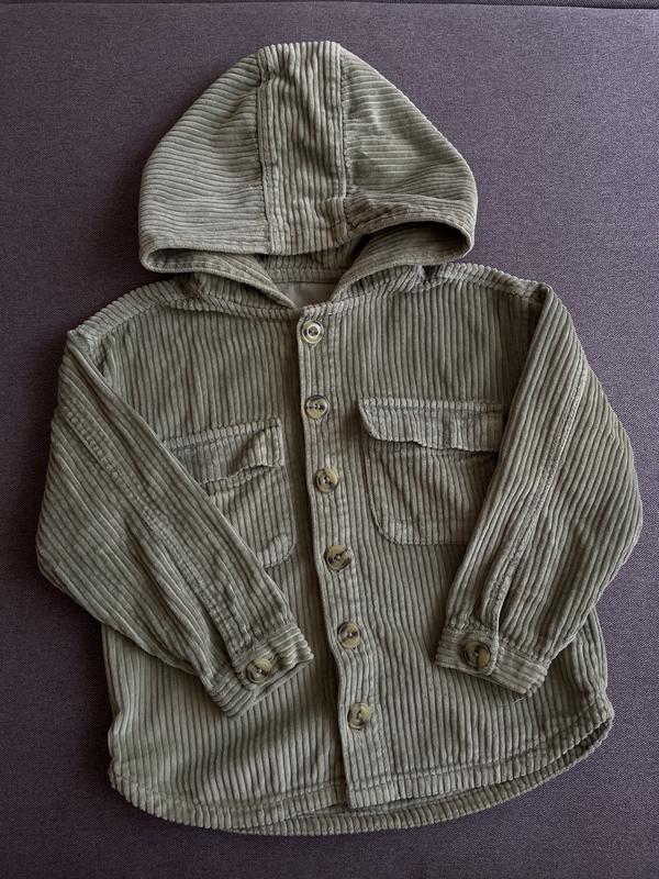 Рубашка вельветовая с капюшоном на пуговицах. Стан идеален, одели пару раз и выросли. Размер 4-5р.