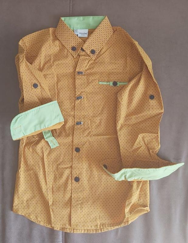 Рубашка Yilgom тёмно-желтая в синюю и голубую цяточку, салатовая отделка. 100% котон, ткань стрейчевая (тянется)