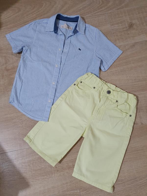 Набором шорты и рубашка H&M на рост 122-128см в идеальном состоянии.Шорты затягивается на резинке изнутри. Пояс 26см, длина 41см.Рубашка ширина 37.5см, длина 48см.