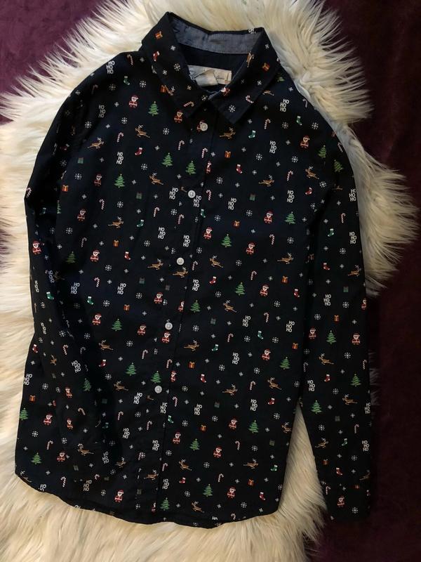 Тёмно-синяя рубашка в новогодний принт H&M 13-14 лет(164), рукав от горла 71(58), шир.47, дл.67-69, сост.идеал.- 280 грн.