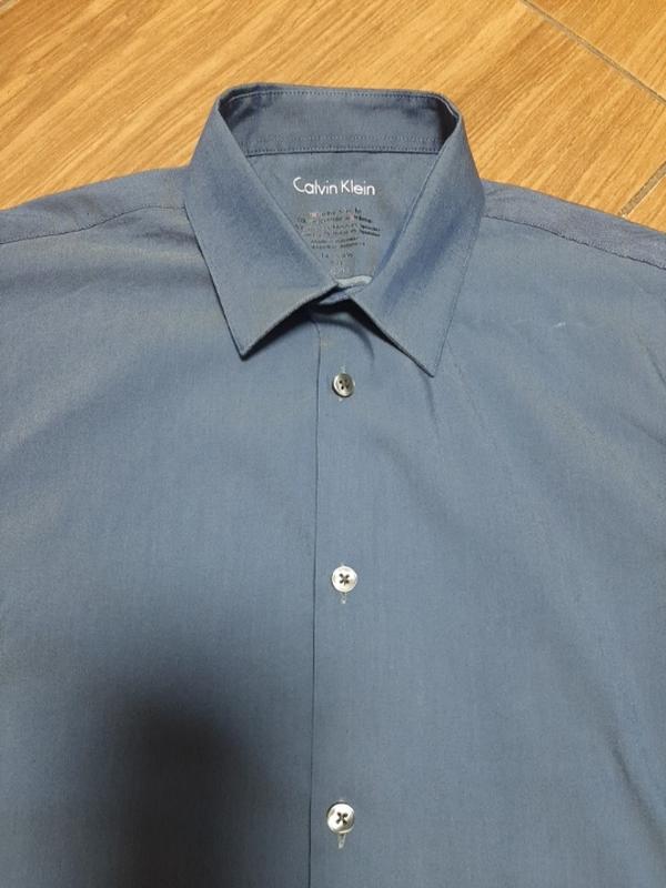 Темно-голубая рубашка от Calvin Klein. Размер 14-14,5 лет,S-M. Замер: плечи 44см, пог 48см, пот 42см, длина 76см, рукав 61см, воротник 36см, Крой приталенный. Ткани приятная, тонкая, тянется. Котон 69%, нейлон 27%, спандекс 4%. Цвет, как на фото 1,3,4.