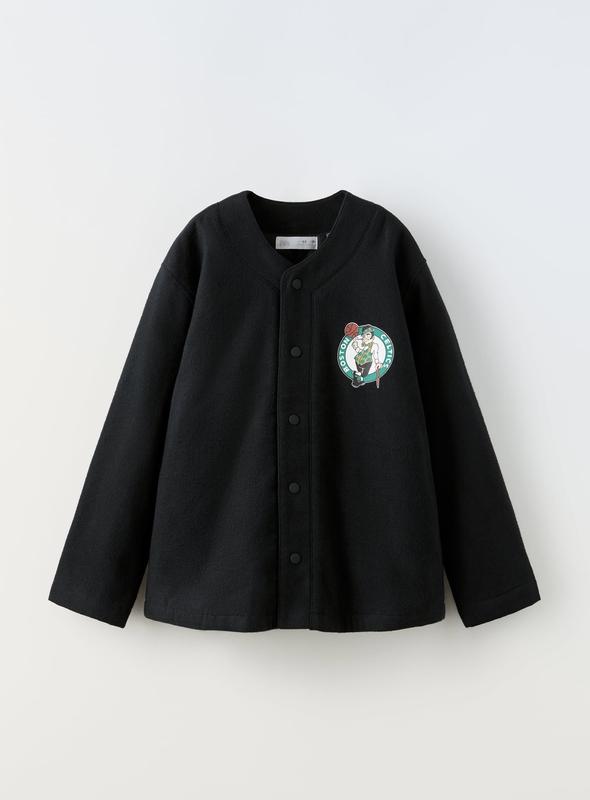 Черная рубашка с V-образным вырезом и длинными рукавами, немного утепленная. Спереди на пуговицах с застежками. Боковые карманы. Текстурированный принт BOSTON CELTICS NBA © на груди и спине. Размер 8-9 лет(130см)