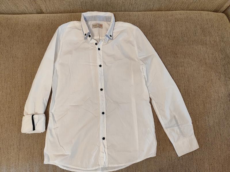 Сорочка Zara . В ідеальному стані, єдиний невеликий ньюанс є плямка- на останньому фото. При звичайному пранні не випралась. В іншому в ідеальному стані. Заміри на фото. Дуже гарна і стильна. Рукава можна підкочувати. Тканина хлопок . По бірці 13/14 років, зріст 164. Дивіться заміри на фото