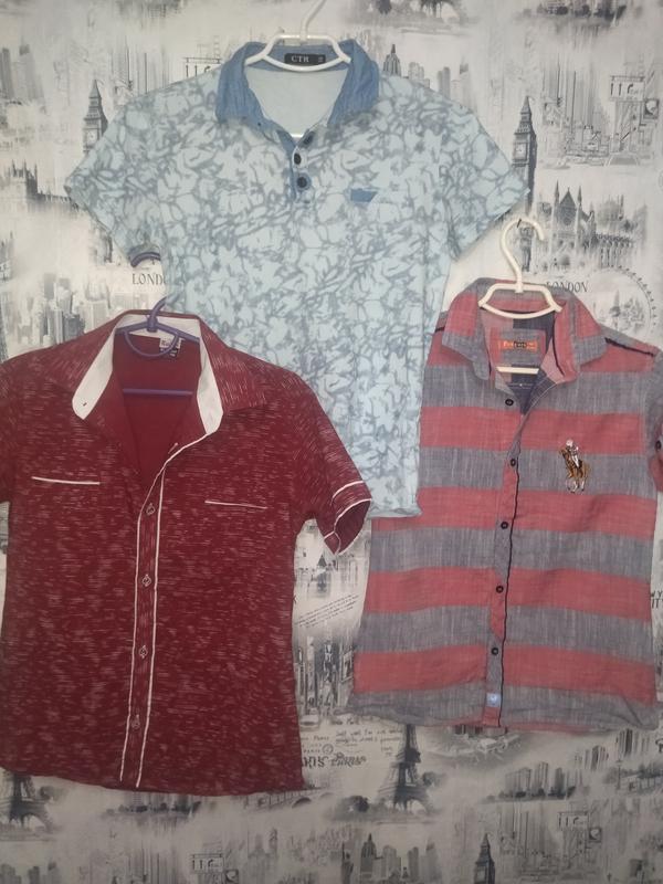 Две рубашки и футболочка поло. В идеальном состоянии, хорошем качестве, будут на мальчика 11-13 лет, замеры на фото. Полосканая рубашка очень легкая, приятная, бордовая плотнее. не секонд, вещи сына.