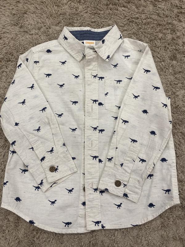 Очень красивая, качественная рубашка, дорогой детский бренд, заказываю на офец сайтах. Принт динозаври . Состояние новой.