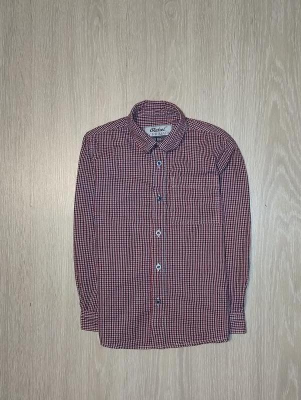 Фірмова сорочка на 5-6 роки. Застібається на ґудзики. Склад 100% бавовна. Стан відмінний Заміри: довжина по спинці від плеча 45 см, ширина між пахвами 35,5 см, плечі 29 см, рукав від плеча 38,5 см, по внутрішньому шву 30,5 см