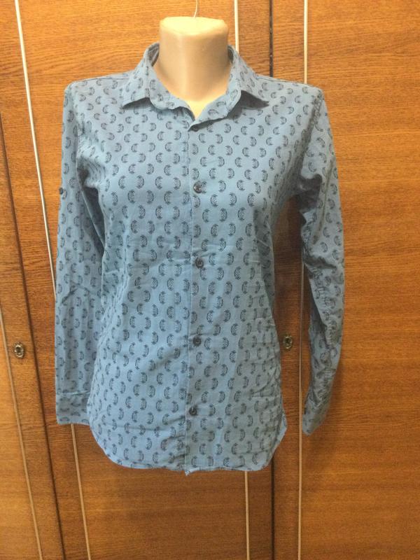 Турция. ПОГ - 44 см Рукав- 54. Может подняться на пуговицу и будет тенниска. Плече- 12 см. Довжина по спині - 60 см. Тканина мякенька. Не хмакается. Голубого цвета.