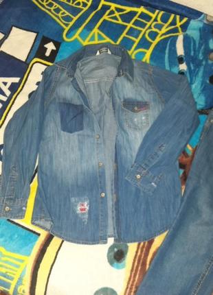 Рубашка джинсовая в идеальном состоянии, можно вместе с брюками получится как костюм Брюки в идеальном состоянии, единственный нюанс потертости (две линии на колене) это фабричный нюанс (похоже на то, что будто так и должно быть) Можно как вместе так и по отдельности. Рубашка на рост 122-128 цена 150, Брюки на рост 140, цена 200