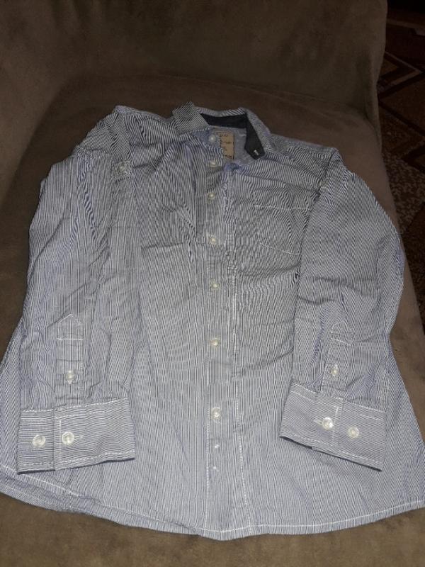 Рубашка в мелкую синюю полоску, рукавчик закатывается, фото не передает, идеальное состояние, впечатляющее качество. Длина рукава 51 см длина рубашки по спинке 62 см пог 44см