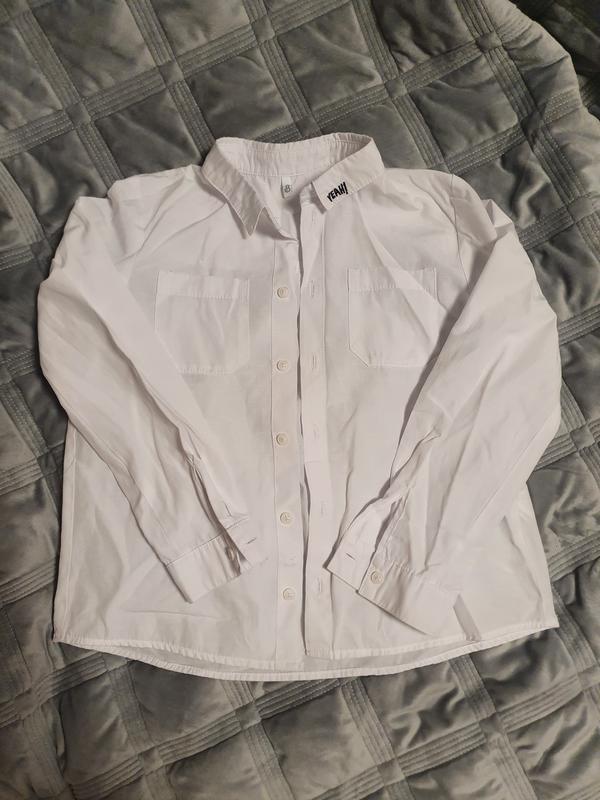 Очень классная, белоснежная рубашка. Стан идеален. На рост 128 см. Очень качественная, есть запасная пуговка. Идет свободного кроя. По типу оверсайз. На мальчика среднего телосложения или плотненкого