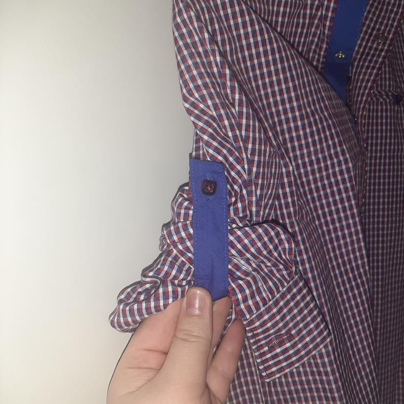 Рубашка в клетку до длинного рукава, который регулируется можно подкатывать. Рубашка новая но без бирки, срезали но не одевал.