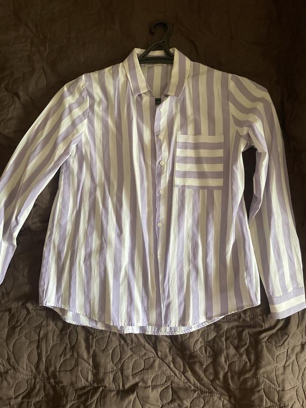 Сорочка жіноча біло-фіолетова в смужечку в ідеальному стані, одягали декілька разів. Є додатково в комплекті ґудзик