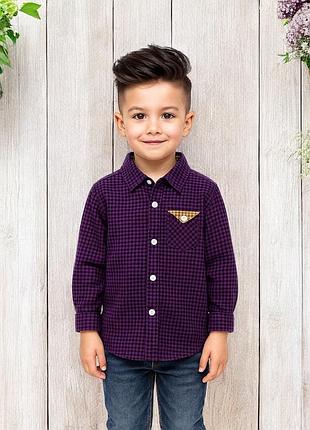 Стильна сорочка для хлопчиків Розмір:120 Довжина-53см рукав-41см плечі-30см напівобхват грудей-35 Матеріал:Хлопок Колір:Фіолетовий з чорними дрібними клітинками Стан: Нове