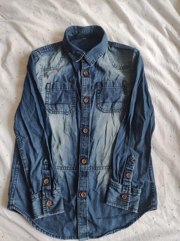 Джинсова сорочка для хлопчика. на 7 років, 122 см. Тоненька і м'яка, стильно виглядає. Маємо джинси, метелик, що разом створює святковий вигляд)