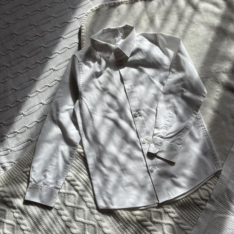 Біла сорочка f&f 9-10 років, ідеальний стан. Рукав від плеча 49см Довжина по плечу 51см (по центру більше) Ширина під рукавами 40см 65% поліестер, 35% котон