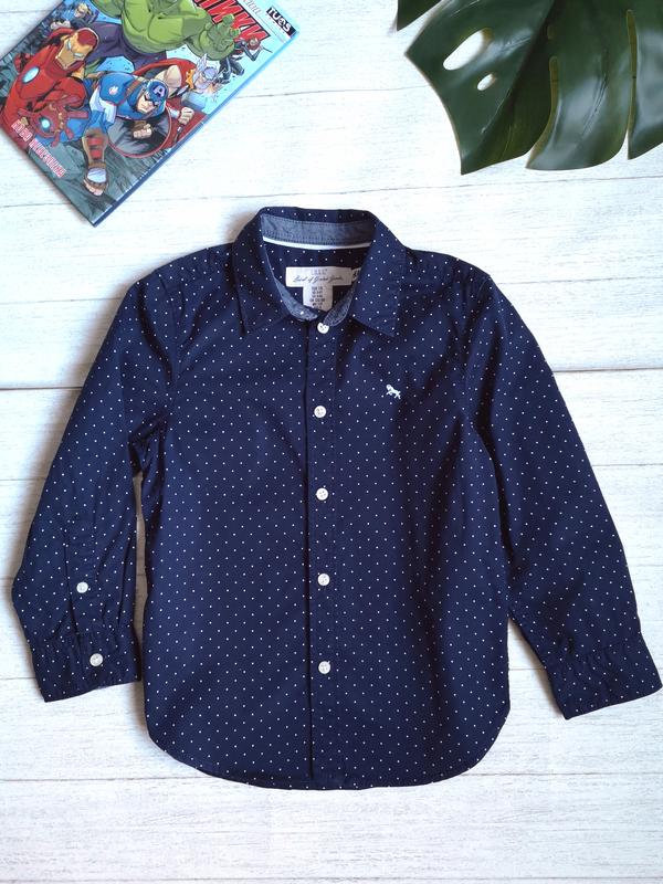 Стильная рубашка с длинным рукавом. Есть нюанс - на спине есть маленькие пятнышки, на ткань попал отбеливатель. Это видно на последних снимках. Если не знать, то не заметно. Замеры : длина 44-48 (округлый низ), ширина 36, рукав 39.