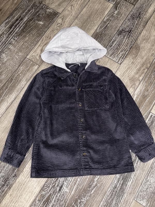 Вельветовая рубашка с карманом и капюшоном. Стан новой, прогадала с размером, одели всего раз. На возраст 5-6 лет