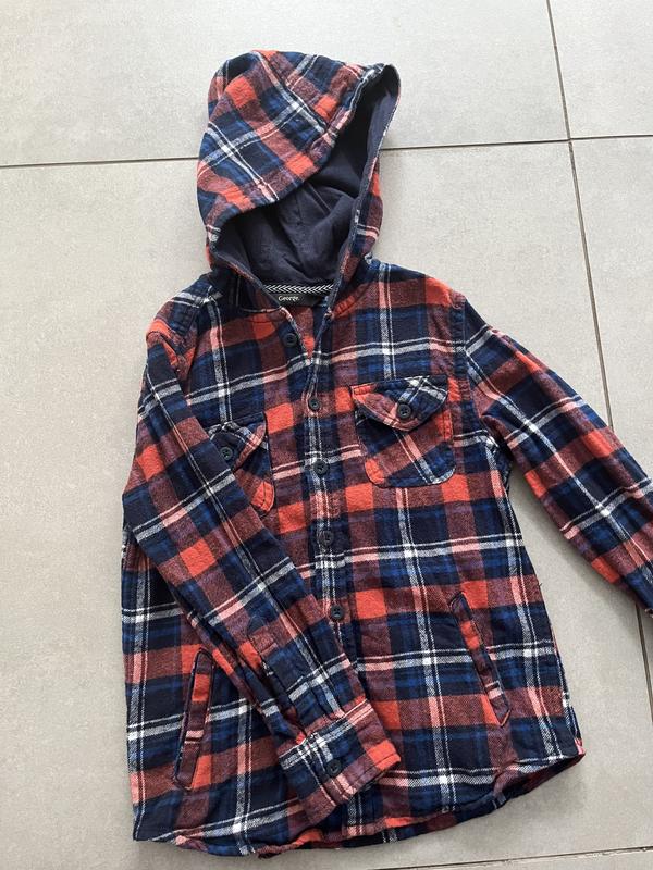 Стильна, тепленька сорочка в клітку з капюшоном. Стан ідеальний. Одягали 2 рази. Розмір 5-6р