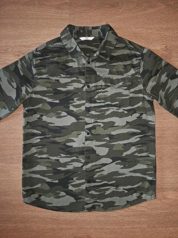 Красивая и стильная рубашка Marks & Spencer защитного цвета. Обладает идеальным состоянием. Застежки на кнопках. Страна производитель – Бангладеш. Состав ткани – 100% хлопок. Евроразмер - 164 см. На молода в возрасте 13-14 лет. Бірки на фото. Замеры в объявлении. Капюшона в комплекте не имеет. ЗАМІРИ СОРОЧКИ M&S Длина по спине - 67-68 см Ширина под рукавами - 50 см Длина рукава от плеча - 60 см Длина рукава от воротника - 72 см