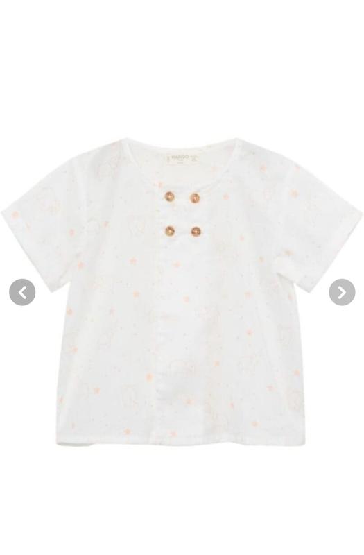 Рубашка для новорожденного детвора, фирмы Mango baby Подойдет как для девочки так и для мальчика. возраст указан 3-6 месяцев. Купила для дочки, но так и не одевали, упакованных, новое. Имеет рисунок оранжевым цветом звездочки и слоники..