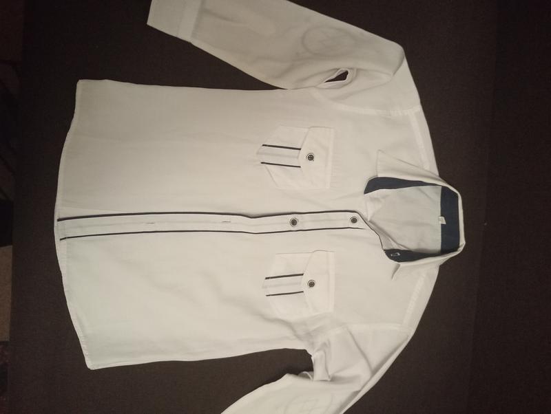 Гарна сорочка для хлопчика. Біла з темно синіми нашивками. Заміри на фото Дивіться ще мої оголошення. Є багато різних речей нові та б/у. Розпродаж в зв'язку з переїздом. До кожного замовлення подарунок. Мінімальна сума замовлення 80грн.