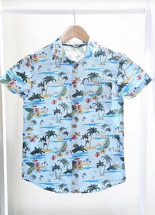 Легка сорочка шведка рубашка від Primark крутого дизайну з пальмами та морем Нова, дуже стильна та супер якісна. В ній шкіра буде дихати. 100% коттон, дуже легка. Виробництво Індія На хлопчика 11-13 років, зріст 164см. Заміри: Довжина 64см Ширина 46см