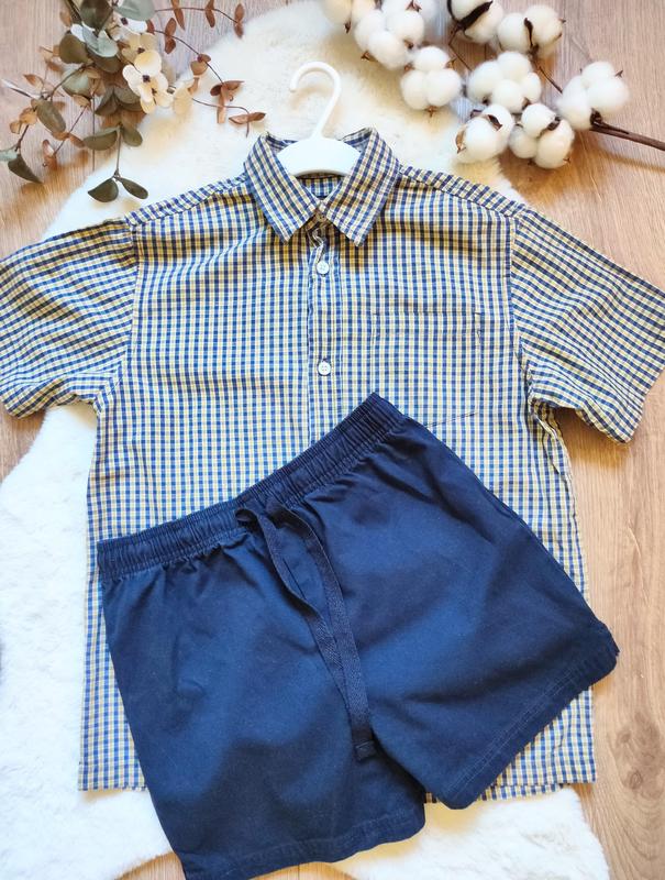 Набор летней одежды (рубашка + шорты) от брендов M&S и JCB для мальчика в возрасте 7-8 лет, на рост 122-133см 😎☀️ Замеры: 1. Сорочка JCB Длина 57,5 см Плечи 38 см Ширина под рукавами 44 см Состав : 100% хлопок☁️ Рубашка достаточно объемная, указанная на возраст 7-8 лет, рост 133 см 2. Шорти M&S Длина 32,5 см Пояс 28,5 см Состав : 100% хлопок Цвет темно-синий Navy