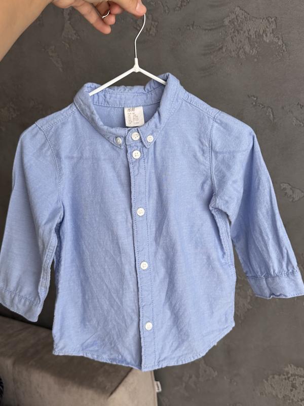 Сорочка від фірми h/m у розмірі 80. Склад 100% котон. Тканина дуже гарна легенька, нагадує льон. Колір красивий голубий фото не передає. Стан ідеальний.