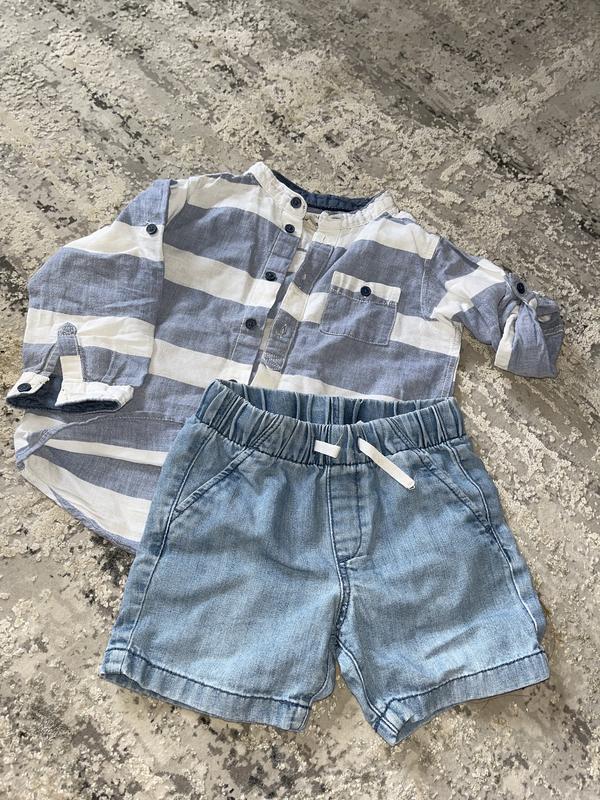 Шорти трішки потерті ,сорочка без явних недоліків . Шорти пише на бірці 12-18 ,але до 2,5 носили . Орієнтуйтесь на заміри (при потребі надам )