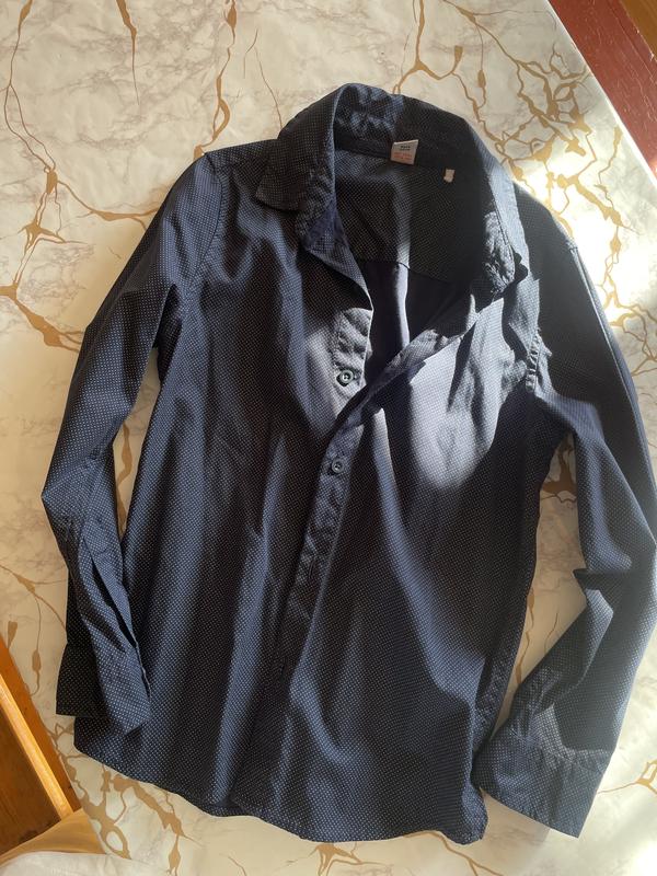 Сорочка 100% бавовна. В ідеалі. Купили. Син надягав пару раз. Дуже стильна. Колір темно синій в мілкий горошок. Заміри на фото є.