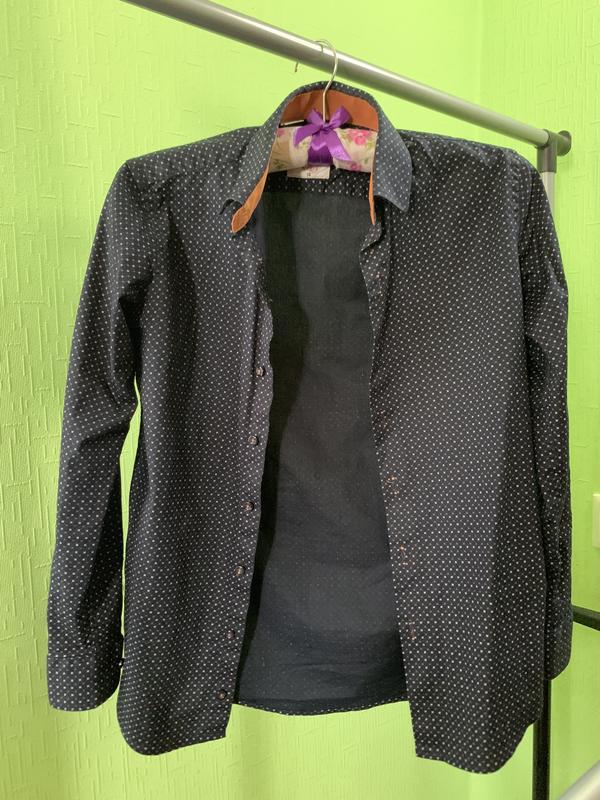 Дуже гарна, вишукана сорочка на підлітка, темно-синього кольору з міленьким візерунком, у ідеальному стані. Розмір 14. Заміри: 1. Довжина сорочки – 59 см. 2. Довжина рукава від коміру – 67 см. 3. Ширина рукава – 15 см. 4. Обхват грудей – 41 см.