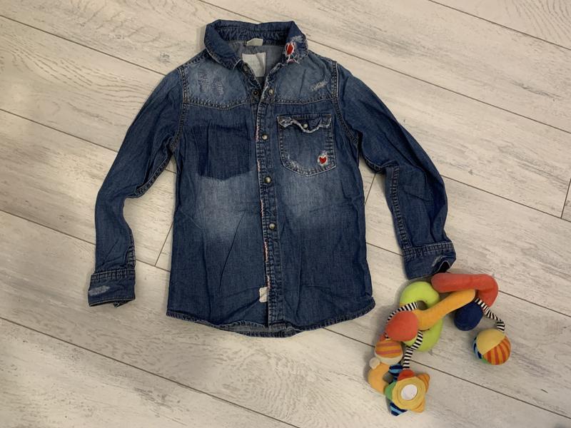 Джинсова сорочка 128 розмір. З недоліків останній гудзик не защипається, все остальне ідеальному станні.