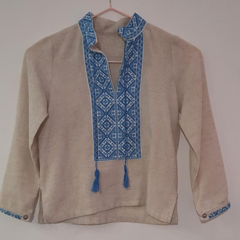 натуральна тканина (льон), ручна вишивка Перша на 5-6 років Друга на 7-8 років Стан ідеальний, без помарок. Вишиванки не "кусючі", на рукавчиках кнопки дуже зручно. Тканина не святиться.