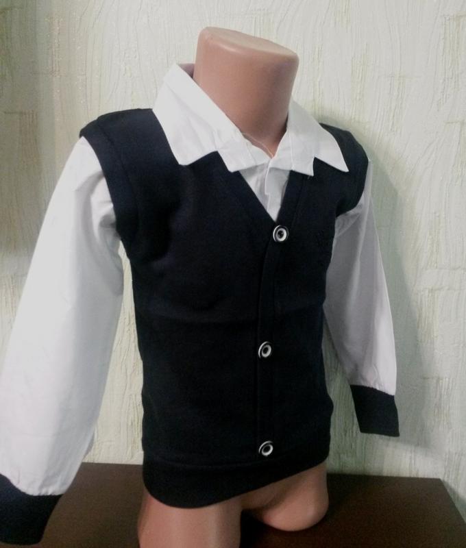 Рубашка обманка для мальчика. Интересная, оригинальная, стильная вещь, которая необходима каждому ребенку, а особенно школьнику. Рубашку- обманку можно одевать без пиджака, а также прекрасно подходит для праздников , ленеек, выступлений. В такой одежде Ваш ребенок всегда будет стильным,и оригинальным. Ни один учитель не сможет сделать замечания ребенку по поводу формы одежды. . Материал- турецкий трикотаж. Рукава ― рубашечный материал их х/б. Цвет темно-темно синий. Качество отличное. Размер 5-6, , лет. Полномерный размер длина / рукав от плеча/ рукав полностью 5-6 лет 40,5см 36,5см 44 см