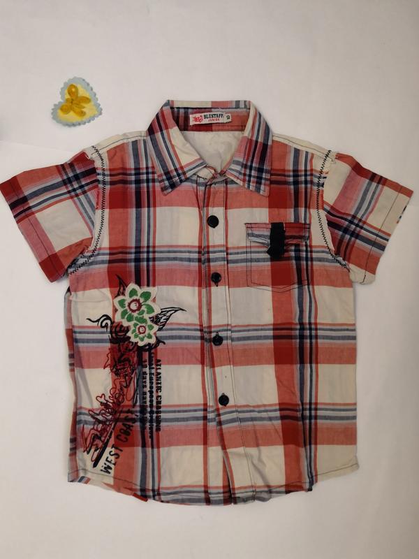Рубашка Blustaff junior на 10 лет. Замеры: длина 50 см, длина по боковому шву 44 см, плечи 33 см, рукавчик 13 см, полуобхват груди 38 см, полуобхват талии 38 см.