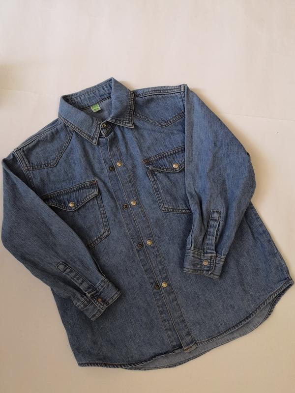 Джинсовая рубашка бренда Prenatal. Указан размер Л. Подойдёт на 6-8 лет. Замеры: длина по спинке 50 см, плечи 34 см, полуобхват груди 40 см, рукав от плеча 36 см, полуобхват талии 40 см. Ткань качественная, в составе 100% хлопок. Спереди кнопки-застёжки, 2 кармана на кнопках. Рубашка красивая и удобная.