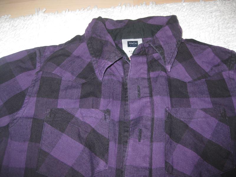 Хлопковая супер рубашка фирма M&Ko. 100% хлопок, фиолетовая с черным. Мальчик в такой рубашке красавчик. можно носить сверху брюк, можно заправить. размер 6-7 лет, рост 122 см. Состояние идеальное. Замеры: длина 46 см, ширина 37 см, длина рукава от плеча 42 см, плечи 32 см. 70 грн