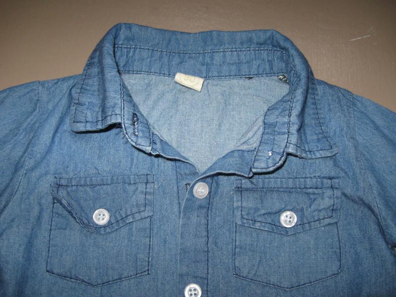 В очень хорошем состоянии. Рубашка джинсовая на рост 90см. Ткань средней плотности. Замеры: ПОГ=29см, длина по спинке=32см, длина рукава28см, ширина плеч=25см