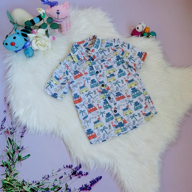 Продам стильную модную рубашку m&s малышу 3-4 года состояние отличное. Состав -100 % хлопок. Цена - 95 гр. Замеры: общая длина от плеча-42,5 см, ширина по спинке под рукавчиками-32 см, ширина плеч-26 см.