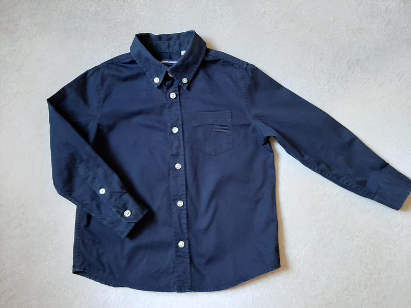Стан ідеальний , без плям і дефекту одягали пару раз . Сорочка щільна ,рукав довгий, застібається на гудзики. Колір: темно-синій розмір: 4 роки 110\116 склад: 100% бавовна