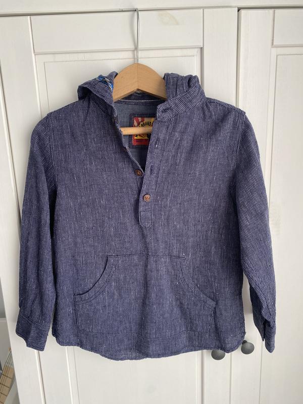 Новая стильная рубашка с капюшоном, одевается через голову. Можно подворачивать и фиксировать пуговицами рукава. 2-3 года/98см.