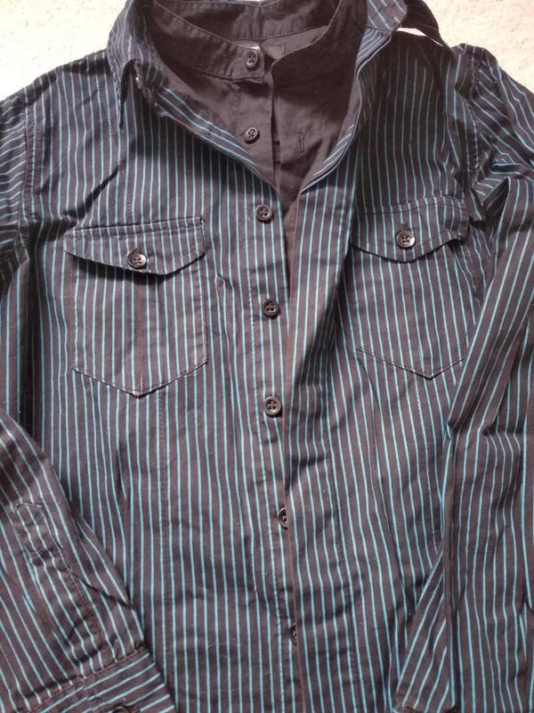 Дуже оригінальна крута сорочка на підлітка 9-11 років. Колір чорний і темно-зелена полоска. Ідеально до брюк, джинсів чи котонових штанішок. Заміри зроблю, звертайтесь.